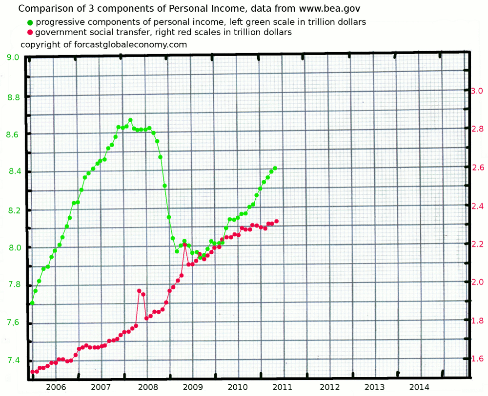 In Comment 77 of August 16, 2010, it has been pointed out that the recovery of Personal Income is mainly due to the Government transfer of money into the pockets of consumers. The progressive component of Personal Income, that includes private wage and salaries, proprietor's income, and interest and dividend income, is only growing meagerly. Since one year has passed from the last data used in Comment 77, it is worthwhile to look at the situation of Personal Income again. In the graph at the right, the progressive component of Personal Income is plotted as the green dots, and Government transfer as red dots. Both curves are plotted in linear scale with units of trillion dollars. We can see that the progressive component lost 700 billion dollars during the recession, but only regained 450 billion dollars by May of 2011, whereas Government transfer component has jumped more than 400 billion dollars since the onset of the recession. The public works program thrown in by Government to stimulate the economy is contributing to the rise of the progressive component, too. Considering all this, it should be clear that the recovery is still mainly upheld by the massive government deficit spending. This also underscore our warning that serious cut in government deficit spending will induce another recession.