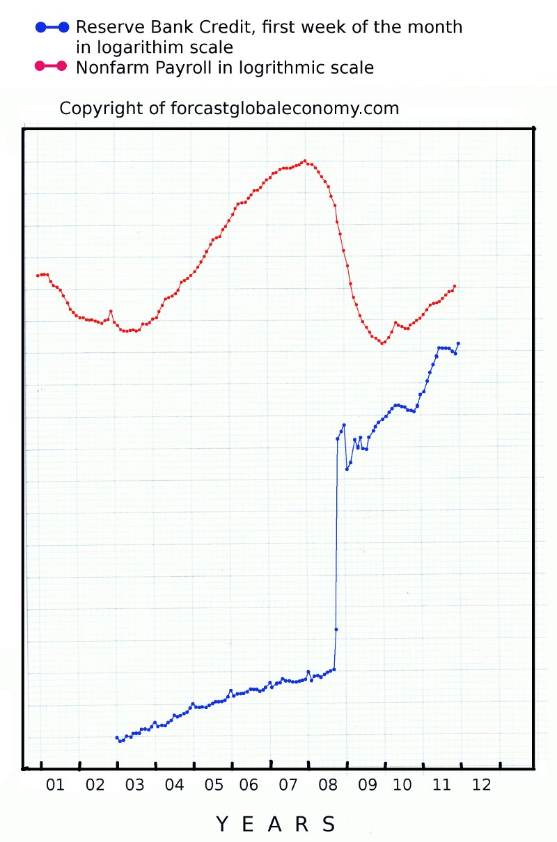 The red curve in the graph is the monthly nonfarm payroll number plotted in the logarithmic scale. Comparing the blue money creation curve with the red job creation curve, we can see that QE1 had arrested the decline of the red job curve by the winter of 2009 to 2010, and then pushed it up through the spring of 2010. However, as QE1 came to the close around the late spring and the early summer of 2010, the red job curve started to slacken again. The deteriorating job market then prompted FED to start QE2 at November of 2010. QE2 then pushed up the red job curve again. The temporary stagnation of the red job curve in May and June of 2011 probably was due to the impact of Japan's great earthquake. Ironically as Japan rebuilds from the disaster, the demand of instruments and material for reconstruction probably has added fire to U. S. manufacturing. This demand from Japan in combination with the lingering effect of QE2 have caused the red job curve to rise at a steady rate since July of 2011, though QE2 has officially ended at the end of June, 2011 as confirmed by the behavior of the blue money creation curve.