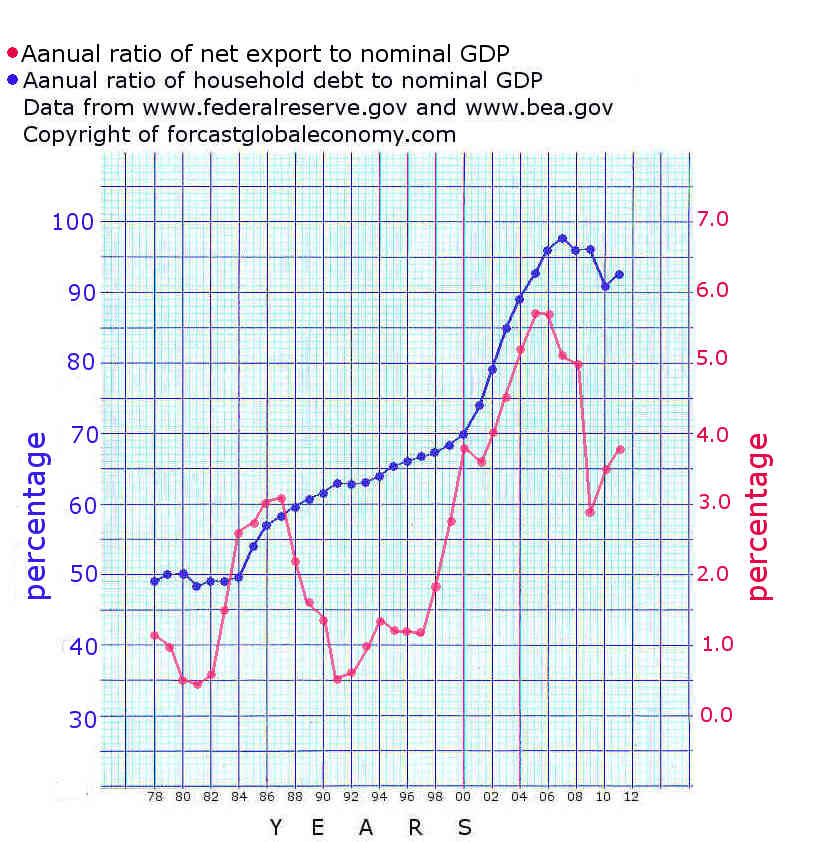 The red curve in the graph at the right is the annual ratio of the trade deficit over the nominal GDP. It shows that the red curve leads the blue curve. That is, the trade deficit builds up first during the bubbling phase, and it induces the growing consumer debt load with some time delay. When the bubble bursts as the trade deficit wanes, the consumer debt load just stop growing but never decline until the self-destruction of the globalization scheme due to the massive consumer default.