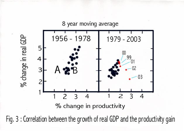 Section 3 is devoted to the detailed study of the long term trends of productivity gain rate and real GDP growth rate, and the relation between those two data sets. During the preglobalization era, that is, before Reagan era, there exists a strong positive correlation between the two data sets. However, in the current globalization phase, this positive correlation has turned into a negative one.