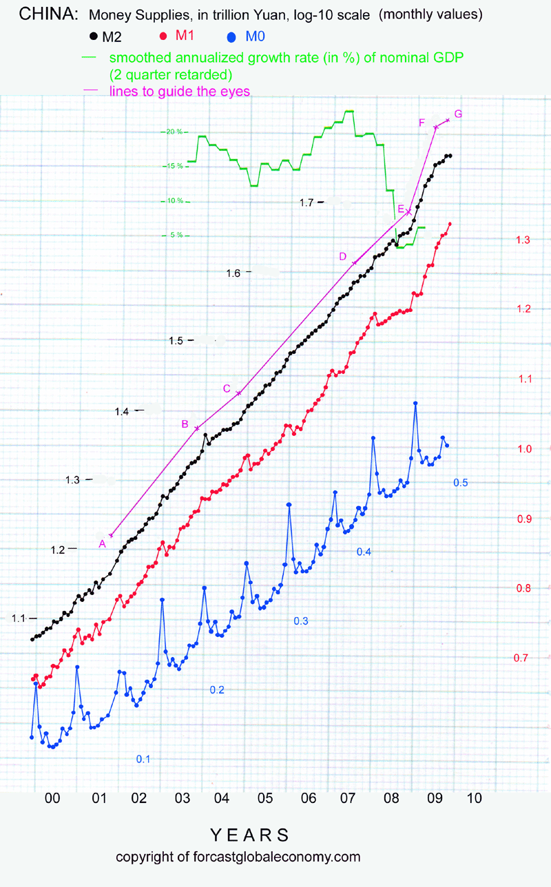 In the graph at the right monthly values of M2, M1 and M0 in units of trillion Yuan are plotted in conventional logarithmic scales as black, red