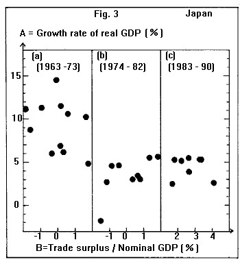 2. All the data about Japanese GDP and trade surpluses are taken from National Accounts section of Major Economic Indicators category of Nikkei Telecom's Japan News & Retrieval. The annualized growth rates of real GDP are the average of the growth rates of four quarters within a calendar year.