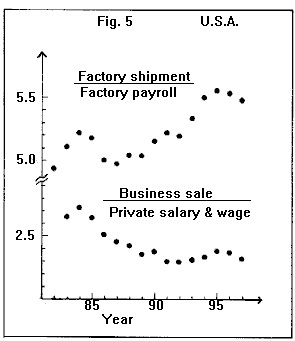 When the ripple effect of the Japanese folly reaches Russia and starts to threaten Latin America the debt instruments of which the hedge funds hold aplenty, the speculators in the first wave have suffered heavy losses. They are forced to sell American stocks to make up their losses and unwind their "yen carry trades", triggering corrections in the stocks and the dollar. We should be aware that the movement of the dollar will effect the trade balance with a delay of about one year. The high flying dollar in the time span from the summer of 1997 to August of 1998 will make American trade deficit explode until the summer of 1999, and the American economy will continue to grow strongly until that time. However, the sharp fall of the dollar starting from August of 1998 will translate into the slow down of the expansion of American trade deficit and thus the slow down of American economic growth starting from the fall of 1999.