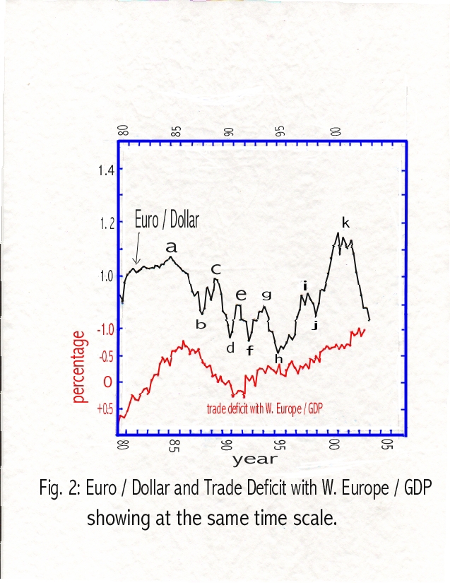 The sharp upward revaluations of Japanese Yen and German Mark against US Dollar, started in 1985 finally curbed the exploding US trade deficit. From the red curve of Fig. 2 we can see the US trade deficit against W. Europe peaked in 1986 and dropped sharply near the end of 1987, and US economy entered the phase of slower and slower growth. Sensing this sea change in economic condition, US stock market crashed in October of 1987 (see Ref. 1 for detailed discussions of US economic booms and busts). The currency market hailed the demise of US trade deficit and immediately started to weaken both Yen and Mark, thus the uptrend of the exchange rate curve marked from "b" to "c". In 1989, Soviet Union started to crumble, and that was a trenmendous boost for Western Europe in general, and Germany in particular, so German Mark staged a quick strengthening as shown on the black curve of Fig. 2 from "c" to "d". However, in 1991 first West Germany overpaid East Germany in the monetary reunion, causing the cave in of East German industries and huge unemployment in the east, and then Russia, following bad economic advises, sank into economic chaos. Realizing that the collapse of the communist block may cause substantial uncertainty in Europe, German Mark started to weaken again as the section from "d" to "e" testifies.