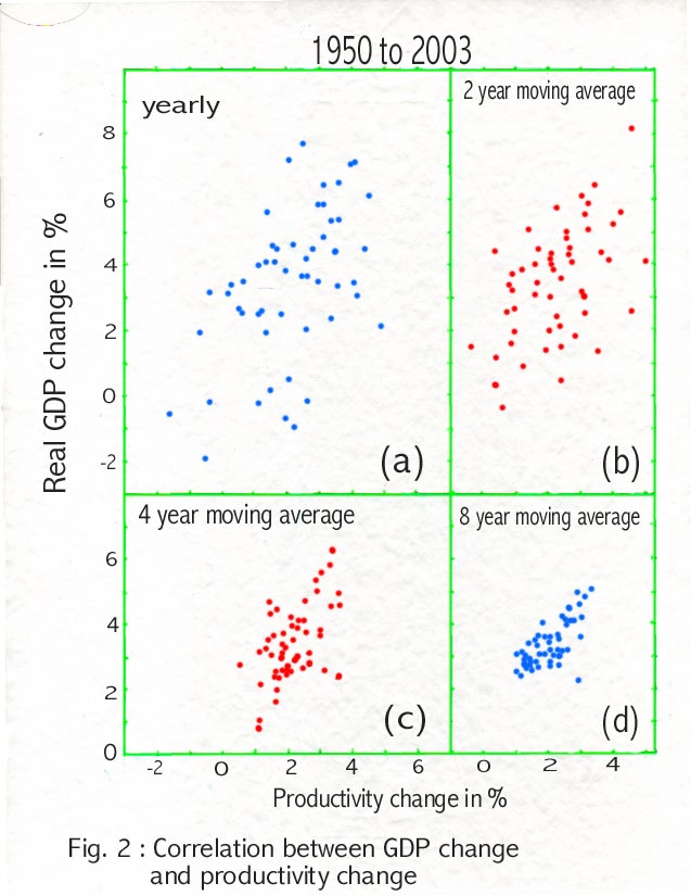 Section 3 is devoted to the detailed study of the long term trends of productivity gain rate and real GDP growth rate, and the relation between those two data sets. During the preglobalization era, that is, before Reagan era, there exists a strong positive correlation between the two data sets. However, in the current globalization phase, this positive correlation has turned into a negative one.