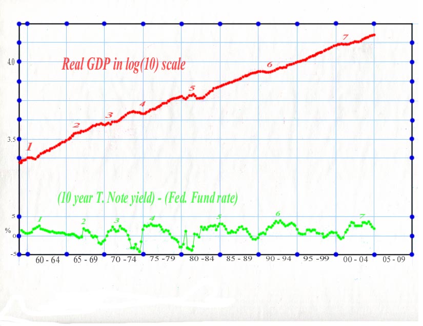 The word "conundrum" is frequently used to describe the refusal of long-term interest rates to follow the rising short-term interest rates. There are many speculations about the reason of this disparate behavior of interest rates. In this website we have also offered an explanation for the behavior of interest rates (see Comment 17). However, many are concerned not about the reason but about the consequence of this behavior of the long-term interest rates. Since the steady rise of the short-term interest rates, the yield difference between 10 year Treasury Note and the Federal Fund has shrunk to about 1 % from over 3 % a year ago. Some claim that when this yield difference becomes negative a recession will hit the economy. Others worry about the burst of the housing bubble when the long-term interest rates start to rise and the yield difference stops to shrink. The purpose of this comment is to investigate the consequence of this peculiar interest rate movement by directly looking into the relevant data themselves instead of doing idle speculations. In the following graph the real GDP of every quarter since 1959 is plotted in logarithmic scale as red points. The quarterly average of yield difference between 10-year T. Note and the Federal Fund is plotted as green dots.