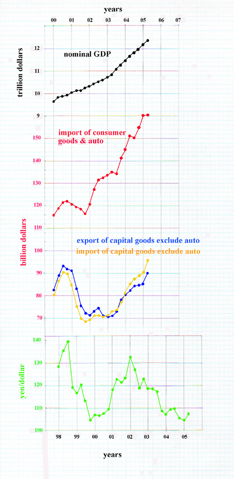 As discussed before, the sharp fall of dollar in the green curve at 1998 has triggered the fall of import of consumer goods and auto of the red curve in 2000; the deficit in the trades of consumer goods and auto accounts for 60% of the total deficit of goods trade. Along with the shrinkage of the total trade deficit, the amount of recycled dollar from foreign private parties and governments fell and caused the burst of the stock bubble of information technology. This in turn dried up the demand for capital goods related to the information technology, and triggered the sharp fall of both import and export of capital goods as manifested in the blue and the brown curves of the second figure. The import of consumer goods and auto bounced back strongly in 2002. By that time two new factors have emerged in the landscape of trades that cannot be accounted for by the value of dollar versus yen alone. The first factor is Euro. Though dollar has bounced against yen only by a modest amount in 2000, dollar has risen substantially against Euro during the year, causing America's trade deficit with Europe to expand strongly in the year of 2002. Another factor is the emergence of China. Since Chinese Yuan is pegged to dollar at a vastly undervalued level, the imports from China have started to surge starting from year 2002. Those two factors in conjunction have caused the import of consumer goods and auto to surge very strongly in 2002. Imports of consumer goods from China has continued to surge in 2003, but the weakness of Euro has bottomed out in 2001, causing the imports from Europe to sag in 2003, thus imports of consumer goods and auto temporarily stagnated in 2003. The strong rise of the imports of consumer goods and auto in 2002 is translated to the rapid rise of the total deficit of the goods trade and increased amount of recycled dollar from foreign hands. This recycled dollar makes long-term interest rates in America low and financial institutions desperate to push abundant funds into the hands of consumers. However, consumer enthusiasm has been tempered by the wind of the second Iraq war and then by SARS scare. Only after the war and the SARS scare American consumers, using plentiful funds pushed into their hands through mortgage refinancing and home equity loans, have started their spending spree and lifted GDP to a rapid rise in the latter half of 2003 compared to the measured rise in 2002. On the currency front both yen and Euro have turned around from their weakness against dollar in 2002, and in other words that dollar has started to fall precipitously against both of them starting from 2002. This event should have sagged the import of consumer goods in 2004, but has not. One important factor in this change is the ascend of China as the biggest trade deficit contributor and its currency has been pegged to dollar at 2002 so its exponentially rising exports have not been disturbed by the tumbling of dollar vs. yen and Euro. Another factor is again Europe. As America's trade deficit moves up strongly the amount of recycled dollar also jump in accordance. This dollar recycling activity has enriched financial markets of America and enhanced the gap between the rich and the poor. The newly riches are addicted to European made luxury goods from automobiles to fashion outfits, and certainly are not deterred from their spending spree by some strength of Euro. Thus America's trade deficit with Europe has continued to rise through 2004. This European factor and the Chinese factor have kept America's overall trade deficit continue to explode upward in 2004. To understand the performance of GDP we need also to consider the trades in capital goods. After the fall of both import and export of capital goods in 2000 to 2001 as discussed before, both export and import have crept along a bottom until well into 2003, lagging behind the import of consumer goods and auto. The import of capital goods is influenced by the desire of fixed asset investment on the part of American businesses. After the burst of information technology bubble, the appetite of American businesses to invest in new high tech equipments has crawled in the bottom for quite a while. Only after consumer spending smartly shot up and the second Iraq war was over, American businesses have picked up their capital goods investment and have lifted the import of capital goods. This increased import then stimulates exports of capital goods since the industry is still in phase 2 as discussed before. The import of capital goods directly adds to the fixed asset investments, but after subtracting from the category of import, it does not contribute directly to GDP. Only when the deployed imported capital goods generate consumer goods, then the import contributes indirectly to GDP. However, the export of capital goods, as long as it is not taking away from the domestic consumption, will directly add to GDP. Thus increased export of capital goods starting from the middle of 2003 in conjunction with the increase of import of consumer goods has been pushing up GDP. Though the capital goods industry is in phase 2, some genuine export of capital goods is still left in America. Since the major competitors of capital goods exporters are Japan and Europe, not China, the sharp drop of dollar against yen and Euro in the stretch from 2002 to 2004 should be boosting the genuine exporters of capital goods through 2006. Recently, in the second quarter of 2005 and beyond, there are signs that the export of capital goods is growing faster than the import. This phenomenon is offsetting the stagnation of the import of consumer goods in the second quarter of 2005 (probably feeling some effect of sharply lower dollar vs. yen and Euro finally) and is keeping GDP growth reasonably strong. In the months of July and August the import of consumer goods continue to stagnate but the export of capital goods continue to out pace the import of capital goods. Thus though the overall 