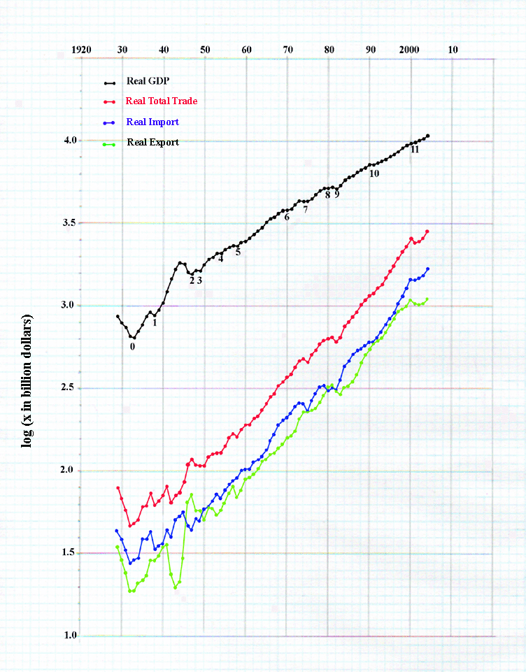 We should note that in spite of eight economic slowdowns showing up as disturbances "4" to "11" to the over all rising trend of Real GDP since 1950, we may draw a straight line rising toward the right as a reasonable approximation to the Real GDP data for the recent 55 years. This implies that the Real GDP of America has risen persistently with an almost constant annual rate of 3.3% a year for the past 55 years. The first thing one will ask is what is the force driving this steadily rising Real GDP? Unfortunately there is not a single answer that will cover the whole range of this recent 55 years since beneath this seemingly uniform growth of Real GDP, there is a sharp structural change in America's economy that is induced by the "globalization". We can mark the first half of 1980's as the period of transition from pre-globalization to globalization. Let us first look at the productivity gains, the standard answer provided by the standard economic theory, called modern economics, for the rising Real GDP. In America productivity gain data are published quarterly. The quarterly productivity gain data are notoriously volatile; they oscillate violently along an economic cycle as is discussed in detail in article 5. In that article we took 8 year moving average of quarterly productivity gain data as representing the long-term productivity gain since 8 years are long enough to wipe out the short-term swings of most boom-bust cycles. When this 8-year moving average of productivity gain is plotted against similar 8 year moving average of the growth rate of Real GDP in a correlation graph, strong positive correlation is observed for the period of pre-globalization, confirming the common notion that the steady growth in Real GDP from 1950 to 1980 is due to the steady gain in productivity. However, in the globalization era, this positive correlation is diminishing rapidly. From the data point of year 2000 and later the correlation turns to negative. This means that higher long-term productivity gain is associated with lower long-term growth rate of Real GDP. This also means that the steady growth of Real GDP in the globalization era cannot be attributed to the productivity gain anymore. This naturally brings our attention to the root phenomena of the globalization, the explosive growth of imports and exports crossing national boundaries, as the driving force of continued steady rise of Real GDP in place of the productivity gain.
