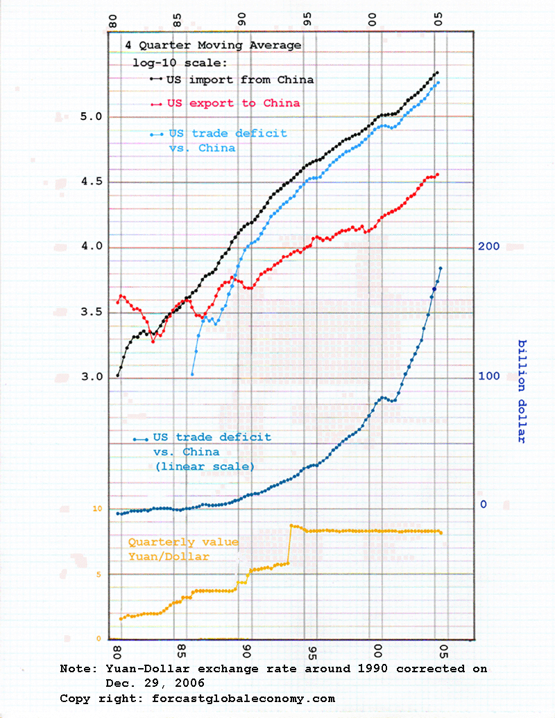 The relations of China-US trade with yuan-dollar exchange rate, yen-dollar exchange rate, and US economic conditions are complex and change constantly with time. In very early stage of the migration of Hong Kong and Taiwan merchants into China, the migrators were very labor-intensive industries. They only need to gather local laborers and can quickly start up the factories to produce goods to be exported to US. Thus the China-US trade responds quickly to the change of exchange rates. The pick up of both US imports and exports with China from 1983 to 1985 was due to the expansion of Chinese economy, not the devaluation of yuan. The continuous devaluation of yuan from 1984 to 1986 and the sharp drop of dollar against yen in 1985 had a dramatic effect of dropping US exports to China in 1985 (show up in the drop of red curve in 1986 due to the delay in 4-quarter running sum), whereas keeping US imports from China growing steadily. The slowing down of the growth rates of both US imports and exports with China around 1990 was the result of US recession at that time. As mentioned before China weathered the Asian economic crisis well due to the substantial devaluation of yuan in 1994. China's exports to US were hit by the US recession of 2000 to 2002 due to the stagnation of the overall US trade deficit. More curious is the steady rise of China's exports to US in 2004. In 2002 US dollar plunged sharply against yen and euro. This drop of the value of dollar would have curtailed US trade deficit in 2004, but did not. As dollar falls against yen, so falls yuan, not only against yen but also against all other Asian currencies that are synchronized with yen. This effect has kept the growth of China's exports to US steady. Since China's trade with US has gained such a heavy weight in the scene of US trade with other countries, the strong showing of the imports from China is holding up the overall US imports of consumer goods. The second leg of drop of dollar against yen had occurred from 2003 to the spring of 2004, and will have the similar effect as the first leg of drop of dollar, that is, US trade deficit with China will continue to rise through most part of 2006. The token upward revaluation of yuan since the middle of 2005 is too small to have meaningful effect on China's exports to US in 2007. However, the steady rise of dollar against yen since early 2005 due to US Federal Reserve Board's interest rate rising activity (see Comment 23 and currency and gold update Nov. 12, 2005) has also raised the value of yuan against yen and other Asian currencies. This ill effect on China's exports to US is going to show up in 2007 and 2008.