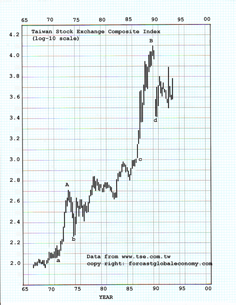 The great stock market bubble of Taiwan from 1987 to 1990 was marked by rampart insider trading and large scale pool operations due to the almost non-existent regulatory oversight at that time. The typical insider trading of that time was for a company insiders to buy its own stocks to drive its stock price sky high. During the rapid rally of the stock, unwary individual investors were sucked into the rally. At the high of the rally the insiders unloaded large blocks of stocks to unwary individual investors to gain enormous profits. The operation of pools was for outsiders to pool resources together to perform similar acts on certain targeted stocks as the above discussed insider trading. As those manipulated stocks rose like rockets, more and more individual investors were sucked into the market and bidded up other stocks not under manipulation to sky-high levels as well. Thus the whole market caught fire. When this madness ran its course and insiders and pool operators cashed in, the bubble naturally burst. The composite index fell from its high of point “B” by more than 80% to point “d” in a very short time. Looking back, the great stock market bubble of Taiwan served as the mechanism to transfer a massive amount of wealth from the newly emerged middle class of Taiwan into the hands of a small number of winners. A portion of the profits generated by this great bubble became the seed money to launch Taiwan into a new phase of high tech based economy after it exited from the Taiwan model along with the burst of the bubble. Other portions of the profits flew into the mainland China, and helped to launch China as the global factory of lower-end consumer goods.