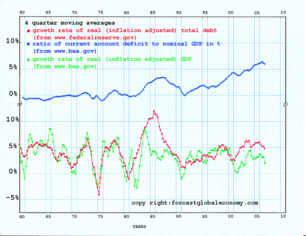 As the ratio of trade-deficit-to-GDP fell to its nadir, US Dollar regain the power to rise against Japanese Yen. Thus the US trade deficit started to expand again from its nadir of 1991. However, the second burst of the US trade deficit needed to wait Japan's near zero interest rate policy that unleashed yen carry trades to push US Dollar sharply higher against Japanese Yen. During this second burst of US trade deficit, a debt bubble did not emerge. Instead the trade-deficit-dollars flew into stock markets and created a stock price bubble. The debacle of US Dollar in 1998 and 1999 caused US trade deficit to decline in 2000 as can be seen from the peak of the blue curve in 2000. As the ratio of trade-deficit-to-GDP came down, so was the growth rate of real GDP. The third burst of US trade deficit has started in 2002, though temporarily disrupted in 2003 by the SARS scare. By the time of this third, or the current burst of trade deficit, China has replaced Japan as the major contributor to the US trade deficit. The movement of Dollar vs. Yen becomes less a factor in dictating the movements of the US trade deficit. Chinese Yuan has been pegged to US Dollar until the middle of 2005, and is allowed to float up slowly since the middle of 2005. Thus the drop of dollar against other currencies except Chinese Yuan from 2002 has a much less effect on the US trade deficit than used to be. Only from the beginning of 2005 US trade deficit less energy has started to stagnate, but the overall trade deficit was kept rising through 2005 due to the rapid rise of the price of crude oil. Only when the oil price stagnated, the US trade deficit has ceased to rise, and the blue curve has peaked and started to fall in 2006. During this current burst of the trade deficit, a debt bubble developed as the substantially higher debt curve (the red one) than the growth rate of real GDP (the green curve) indicates. As the trade deficit starts to fall, the growth rate of debt, the red curve, is falling in tandem, indicating the rapid disappearance of the liquidity glut.