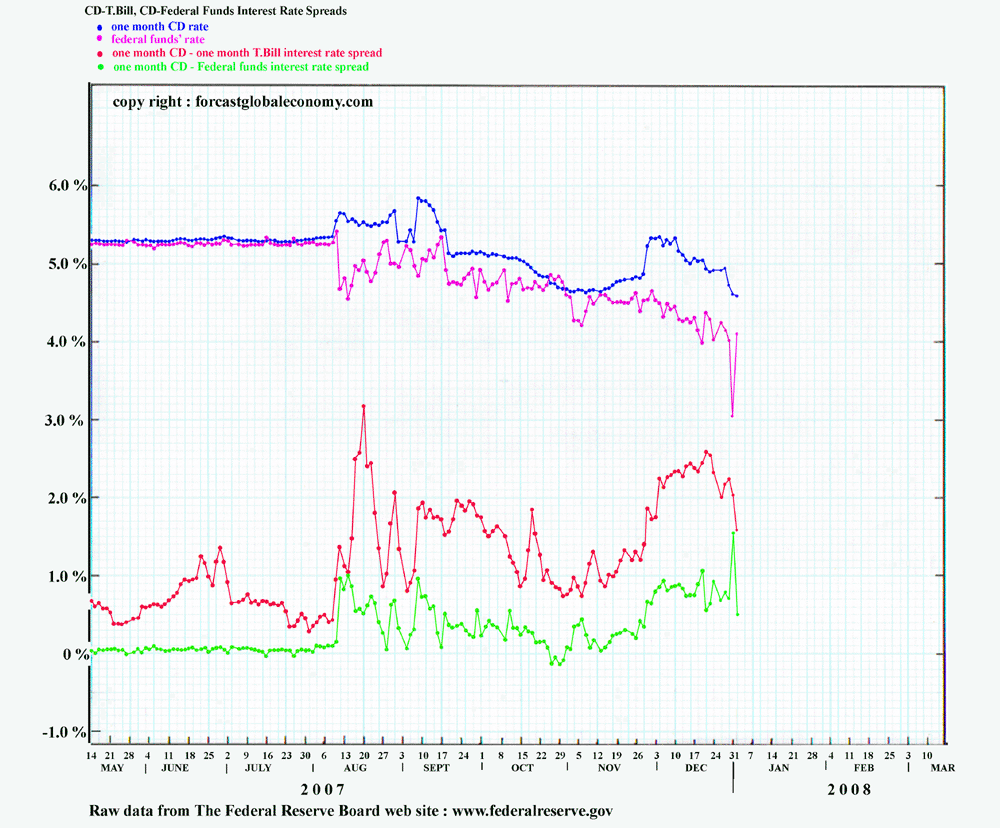 Facing this banking crisis, FED has come up with another unusual idea, that is, the auction of loans in order to inject liquidity directly into troubled banks. At the time of the mid August financial panic, FED has changed the rule of discount window borrowing drastically. The borrowing period is extended to one month from overnight, and all kinds of mortgage backed securities are accepted as collaterals. FED even explicitly urged cash strapped banks to borrow through the discount window. The current interest rate of the discount window borrowing is 4.75% that is 0.5% above the FED's target rate of federal funds but is about 0.25% lower than the one month CD rate. The identities of the discount window borrowers are not revealed by FED. However, FED's attempt to inject liquidity into troubled banks through the discount window has not succeeded since troubled banks are not eager to borrow from the discount window. The precise reason why troubled banks are reluctant to go to the discount window but are struggling to borrow from higher interest rate CD is not well understood. Probably it is due to the historic stigma that most heavy borrowers from the discount window eventually failed. Due to the failure of the attempt to inject liquidity directly into the needy entities, FED has come up with the idea of auctioning fixed amount of loans. The collaterals used in those auctions are the same as those used in the discount window borrowings, and any member who is allowed to borrow from the discount window is qualified to participate in the loan auctions. Further more neither the identities of the ones submitted the bids nor the ones who win the bids in the auctions are disclosed, just as in the case of the discount window borrowing. Also the durations of both the auctions and the discount window borrowing are one month long. Only difference between the two methods of borrowing from FED are the interest rates. The interest rate of auctioned loans are determined by the auctions, whereas the interest rate of discount window borrowing is fixed at 4.75% at present. During December 2007, FED conducted two such auctions, each for 20 billion dollars. Troubled financial institutions participated eagerly. The interest rates of auctioned loans were only slightly lower than the discount window rate. It seems that by just changing the name from "DISCOUNT WINDOW" to auctioned loans, FED has removed the superstition of the "modern" financial system, and has succeeded injecting urgently needed liquidity into troubled financial entities. Thus FED has in effect bailed out the troubled financial entities for the time being. As the proof of this temporary relief, the interest rate of one month CD has come down in step with the rate of federal funds, and thus the green curve, the interest rate spread between CD and federal funds has leveled off. The interest rate spread between CD and T. Bill, the red curve, has also stopped rising as the drop of the yield of T. Bill has moderated.
