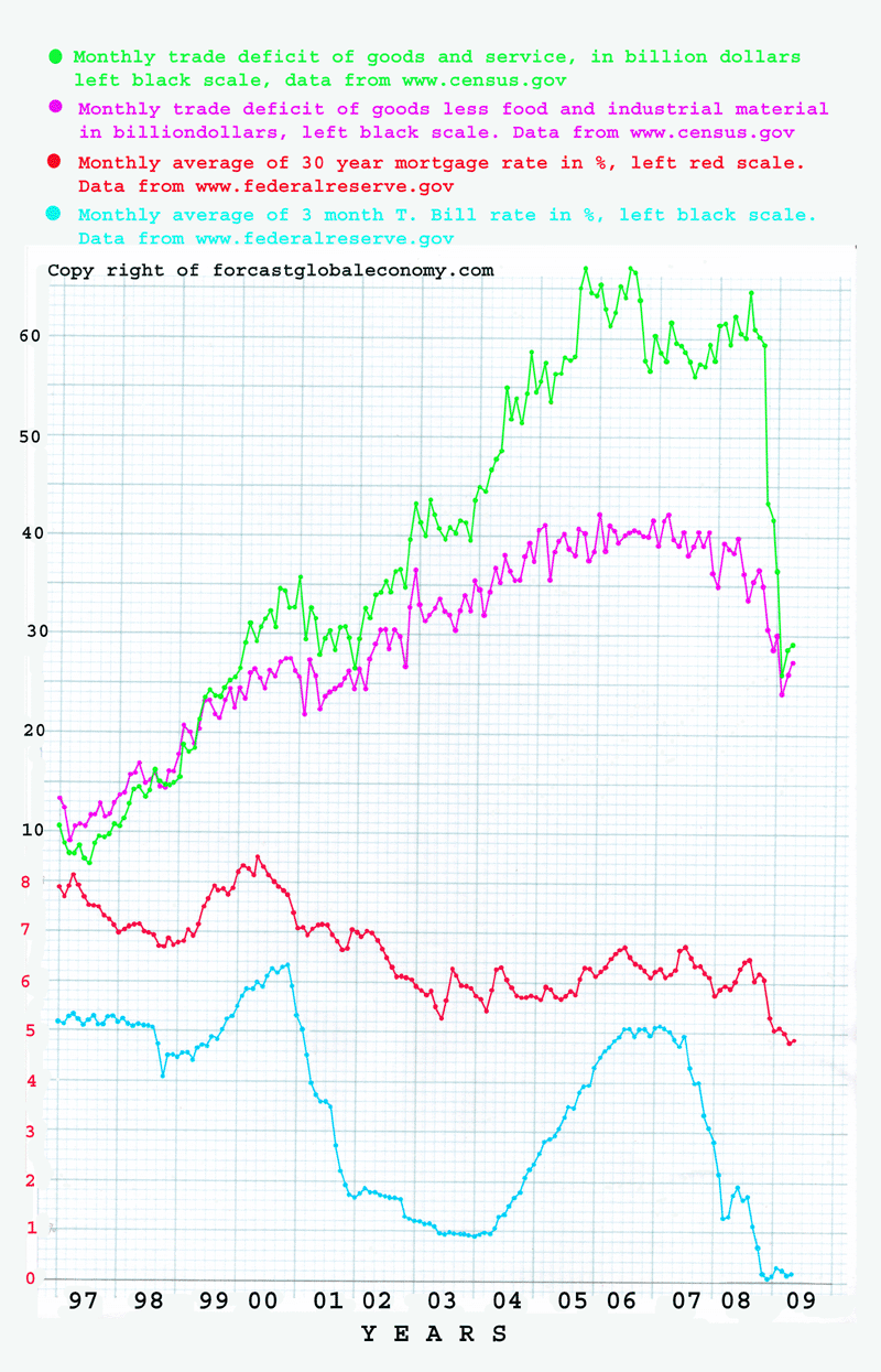 FED controls short-term interest rate by targeting the interest rate of the federal funds market. The federal funds market is the facility for major financial institutions to make overnight loans and borrowings among themselves. FED injects liquidity into or withdraws liquidity from the financial system through open market operations, that is, to trade short-term U. S. Treasuries with major financial institutions. When FED wants to inject liquidity into the financial system, it buys short-term U. S. Treasuries from major financial institutions and pay those institutions with cash equivalent dollar credits that are created from thin air, or more accurately by a few computer key strokes. Flush with dollar credits major financial institutions do not need to borrow so vigorously among themselves, and as the result interest rate of the federal funds market falls. If FED wants to drain liquidity from the financial system, it sells short-term U. S. Treasuries to major financial institutions and takes away dollar credits from their accounts kept on FED’s computer. Deprived of those dollar credits major financial institutions are forced to bid more vigorously to borrow in the federal funds market, and push up the interest rate of the federal funds market. The movement of overnight interest rate of the federal funds market propagates quickly to other liquid short-term interest rates like the interest rate of 3 month T. Bill. Throughout this comment we use 3 month T. Bill rate as the representative of short-term interest rate instead of the unfamiliar interest rate of the federal funds market. In the following graph monthly averages of the interest rate of 3 month T. Bill are plotted as the blue curve, and monthly averages of 30 year fixed interest rate mortgage as published by Freddie Mac are plotted as the red curve to serve as the base of following analysis. Also included in the graph are monthly trade deficit of goods and services as the green curve, and monthly trade deficits of goods less food and industrial materials as the purple curve (majority of deficits of industrial materials is due to the import of crude oil).