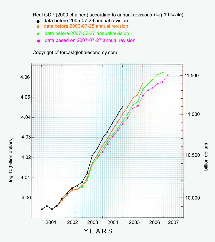 The 2nd quarter (2007) GDP report published on July 27, 2007 shows a +3.4% growth rate of the real GDP for the quarter. Financial media have immediately hailed the surprisingly strong economic growth, and US government officials have come out enmasse to paint a rosy picture for the US economy. However, a detailed study of the GDP report reveals that a massive downward revision of GDP numbers has taken place for many past quarters. The first quarter (2007) real GDP number has been revised down more than 100 billion dollars, representing about 1% reduction from the figure in the “final report” published on June 28, 2007. The advanced GDP report of the first quarter of 2007 was published on April 27, 2007, and the preliminary report published on May 31, 2007. The growth rate of the real GDP from the 4-th quarter of 2005 to the 4-th quarter of 2006 is revised down to +2.6% from +3.1%, and the growth rate from the 4-th quarter of 2004 to the 4-th quarter of 2005 is revised down to +2.9% from +3.2%. If not for this massive downward revision of GDP for the past quarters, the growth rate of the real GDP of the 2nd quarter of 2007 would be -0.9%, a first negative growth rate since the start of this economic recovery in 2002. Thus the current economic recovery has become much weaker than we have perceived before this July 27, 2007 GDP report. The revision on the nominal GDP is a little less than the real GDP. For example, the nominal GDP of the first quarter of 2007 is revised down by 68 billion dollars, representing a 0.5% reduction. This means that the inflation picture through out this recovery is somewhat worse than we originally thought based on the GDP reports before this massive revision. We do not know whether somewhat calmer inflation picture of the second quarter of 2007 is a genuine improvement or is just the result of revising up the inflation indexes of the past quarters.