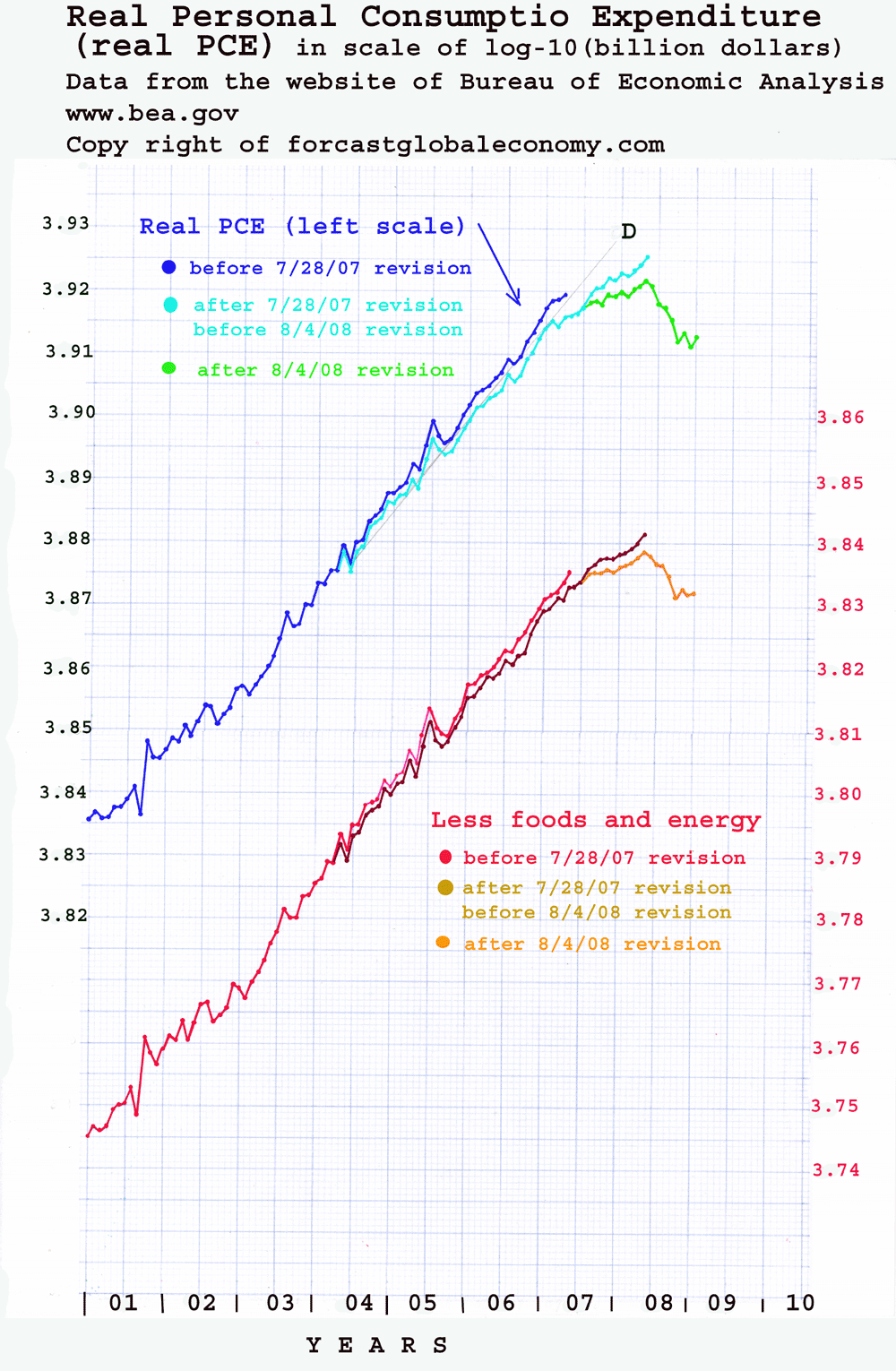 Real Personal Consumption Expenditures in log-10 scales (most recent data: June 2007)