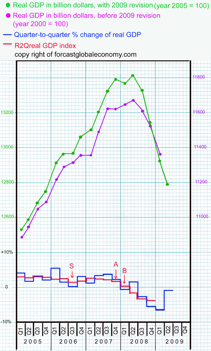 Category 3 type signals are genuine forewarning signals of the incoming recessions. When those signals are issued, usually economic conditions looks like robust so few will heed to the forewarning signal. Let us use the entrance into this recession as an example. The red R2QrealGDP index curve in the second graph dropped below +1.0% in 2008Q1 (labeled as "B" in the graph) so this recession has started in that quarter, the same conclusion as the declaration of NBER. Since the R2QrealGDP index at 2008Q1 can be calculated only when 2008Q3 real GDP data became available at the end of October of 2008, the confirmation that this recession has started in 2008Q1 was made at that time. This confirmation from the R2QrealGDP index system is about one month ahead of the declaration from NBER and three months before the call of this recession from the popular method. The R2QrealGDP index of 2007Q3 (labeled as "A" in the second graph) had dropped below +2.0%. The R2Qreal GDP index of 2007Q3 was calculated by using real GDP data of 2008Q2 that became availabel at the end of July of 2008. By the end of July of 2008 nonfarm payroll number had been declining for six months and DOW had lost 20% of its peak value already. Thus the forewarning signal issued at the end of July of 2008 was a Category 2 signal, and we could conclude that this recession had started in 2008Q1; the confirmation of this recession is thus pushed up by five months ahead of the declaration of NBER and seven months ahead of the popular approach if the R2QrealGDP index system is used.